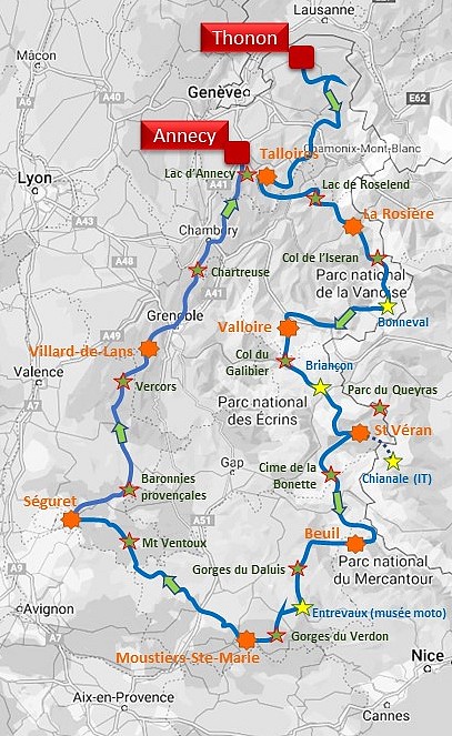 La France est le pays le plus visité au monde. Patrimoine architectural, culture, gastronomie et terroirs, diversité des paysages traversés: tout y est! C’est un paradis de la balade à moto, une invitation permanente au voyage. Au guidon de votre moto de location, en route pour un itinéraire de légende : la Route des Grandes Alpes. Au départ du lac Léman, vous franchirez les cols mythiques et profiterez de paysages extraordinaires, de la Savoie jusqu’au Verdon, avec ses gorges et ses champs de lavandes. Après le Ventoux, cap sur les massifs du Vercors et de la Chartreuse. Voyage de moto en liberté…