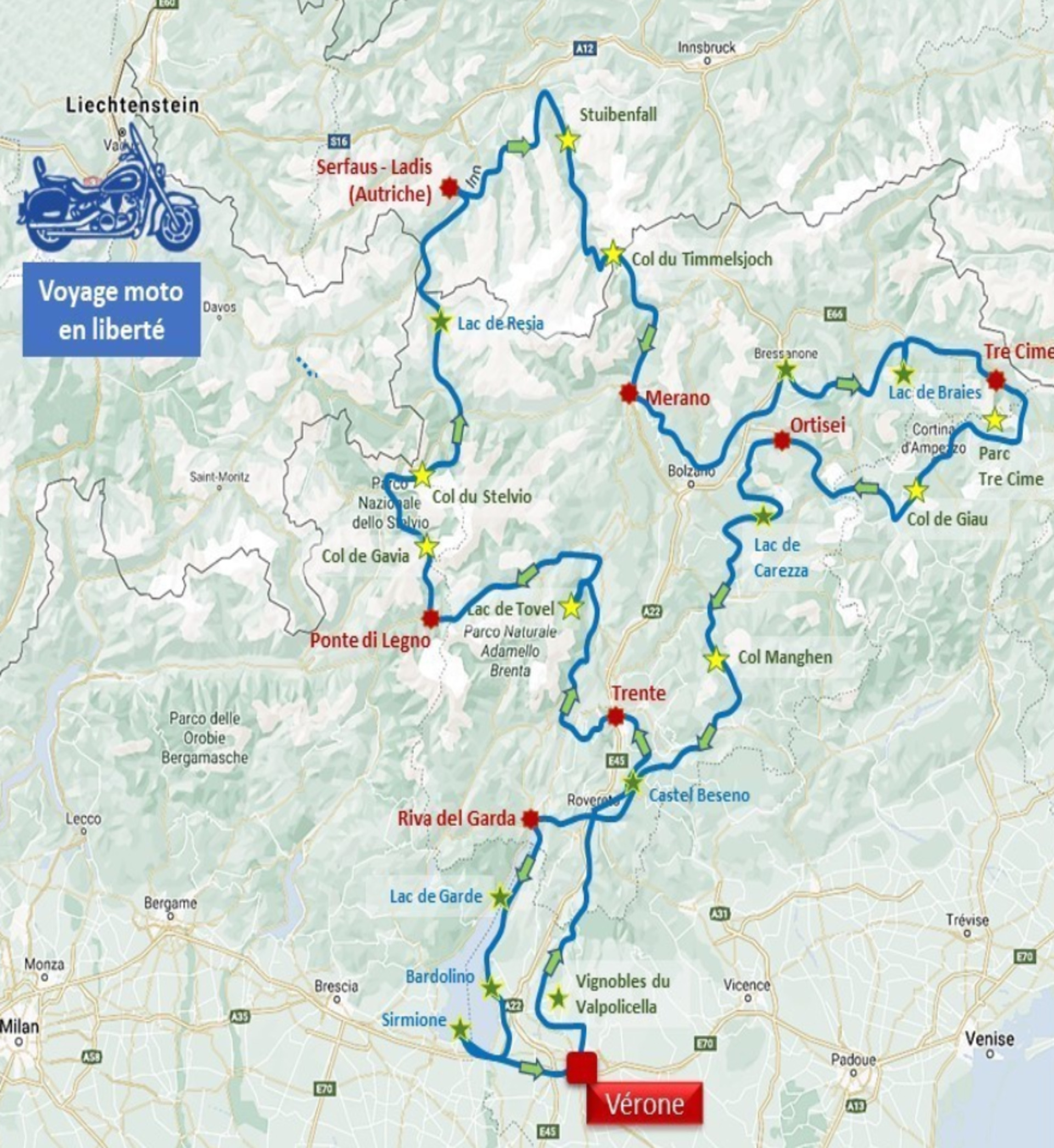 - Tyrols et Dolomites, avec le Stelvio (11 jours / 10 nuits) de juin à septembre.